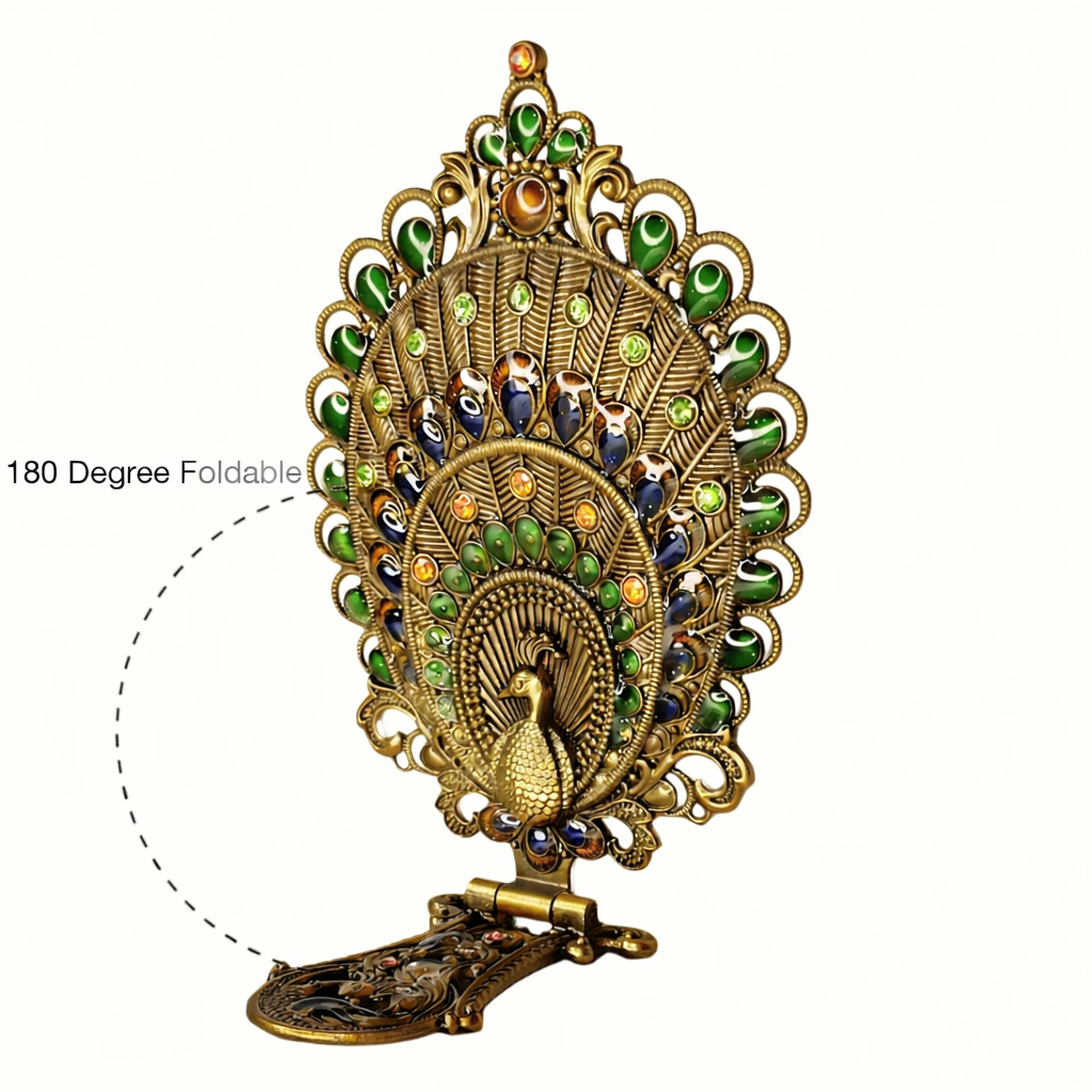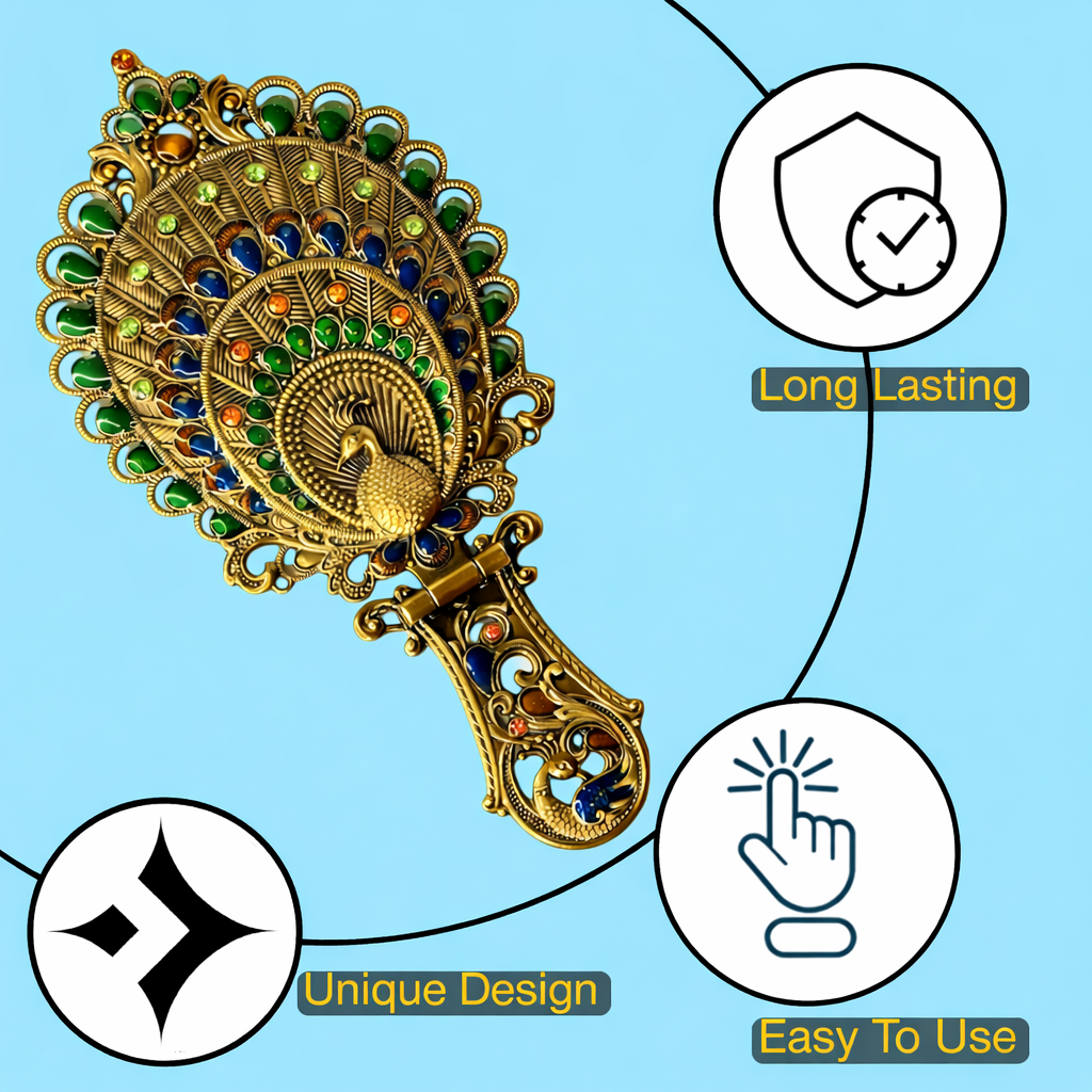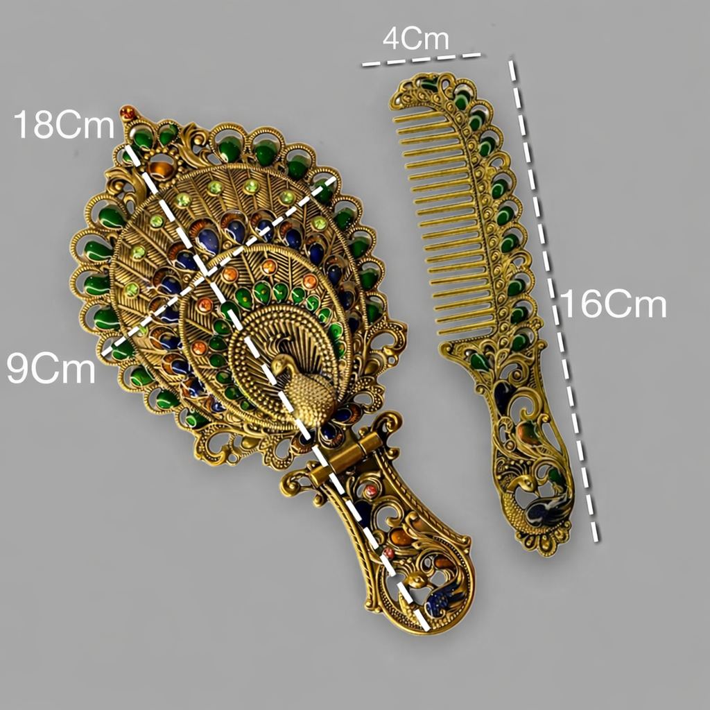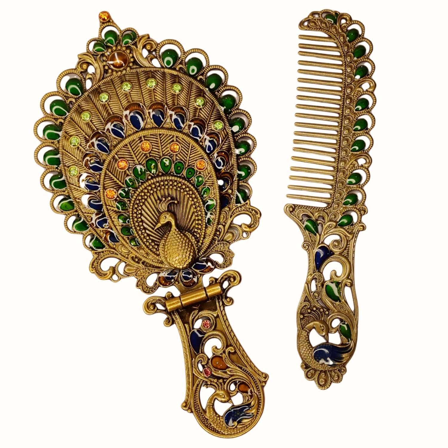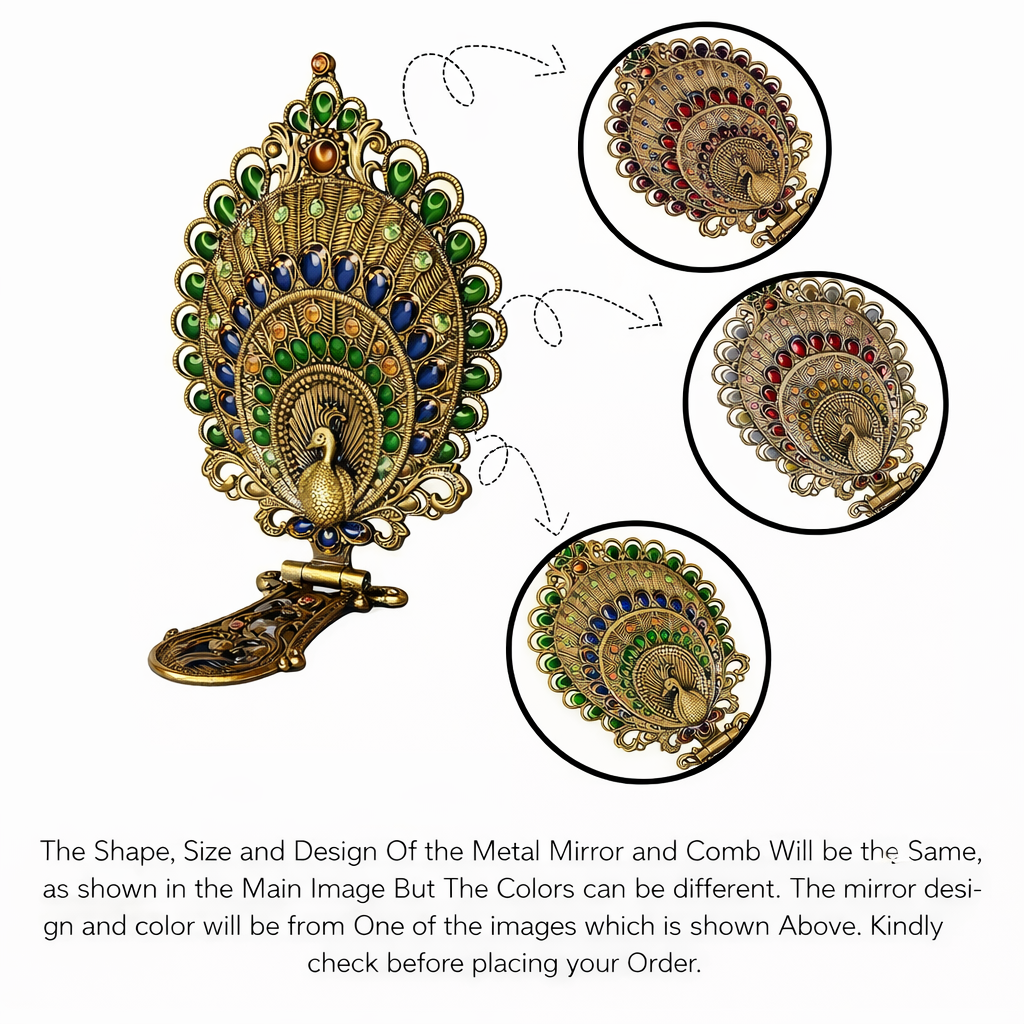 Metal Mirror & Comb Set Handcrafted Peacock Design | Decorative Tabletop Vanity Mirror with Frame | Oval Shape | Multicolour Finish